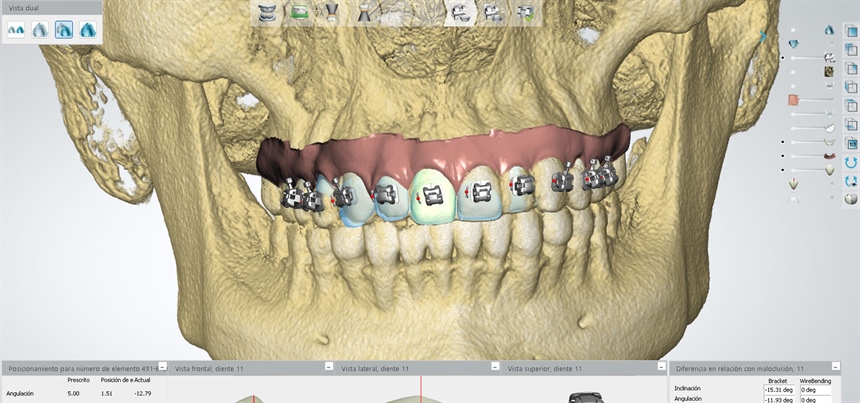 Figura 2. Planeación digital de colocación de brackets en 3Shape OrthoAnalyzer™, utilizando modelos escaneados en 3D integrados con CBCT. Esta integración facilita una visualización más detallada de las estructuras dentales y mejora la exactitud en el posicionamiento.