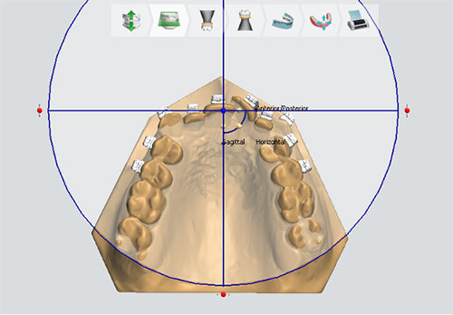 Figura 4. Planeación digital de colocación de brackets en 3Shape OrthoAnalyzer™, con enfoque en la evaluación de angulación y dirección dental. Este análisis es clave para lograr un posicionamiento más exacto y reducir la necesidad de ajustes posteriores.