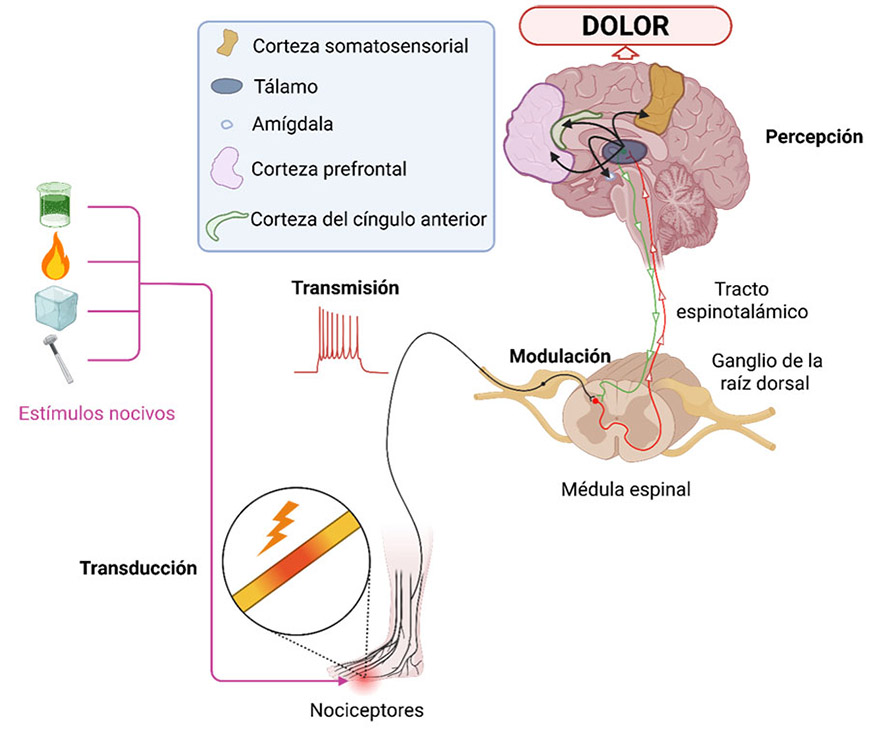 El dolor se percibe mediante neuronas específicas llamadas nociceptores, que son neuronas de alto umbral, capaces de discriminar entre estímulos inocuos y nocivos. Los nociceptores responden a estímulos nocivos químicos, mecánicos o térmicos. Existen dos tipos de neuronas que funcionan como nociceptores: fibras amielínicas C y fibras mielínicas de diámetro pequeño A𝛿. En ciertas condiciones, las fibras de diámetro grueso Aβ también funcionan como nociceptores. La diferencia principal entre los nociceptores es la velocidad de conducción y algunos marcadores moleculares distintivos. Estas neuronas se encargan de traducir los estímulos nocivos de cualquier tipo en potenciales de acción (señales eléctricas), que se conducen a lo largo del axón hasta la parte posterior de la medula espinal, donde hacen un primer relevo con neuronas de proyección, que a su vez conducen la información al tálamo. De éste surgen proyecciones que llevan la información a distintas áreas cerebrales que incluyen la corteza somatosensorial, amígdala, ínsula, corteza anterior del cíngulo y la corteza prefrontal, entre otras. La interacción con estas áreas combina el componente sensorial con un elemento afectivo motivacional para integrar la experiencia subjetiva del dolor (Figura 1).