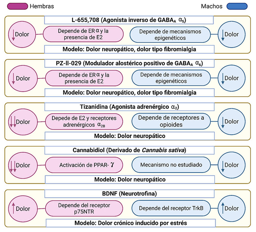 Los receptores ácido γ-aminobutírico A (GABAA) se encuentran distribuidos ampliamente en el cerebro. Estos receptores funcionan normalmente como inhibidores de la excitabilidad de las neuronas. Sin embargo, la función de este receptor en condiciones patológicas (como en el dolor crónico) pasa de inhibidora a activadora. Por lo tanto, la administración de antagonistas de los receptores GABAA reduce el dolor crónico. Estudios de nuestro laboratorio han encontrado que la administración espinal (intratecal) de L-655,708, una sustancia que bloquea al receptor GABAA 𝛼5, reduce el dolor neuropático en ratas y ratones hembra, pero no en machos (Franco-Enzástiga et al., 2021). Además, la administración espinal de L-655,708 es más efectivo para disminuir la fibromialgia en ratas hembra que en machos (De la Luz-Cuellar et al., 2019). De manera similar, la administración espinal de PZ-II-029 (una sustancia que activa al receptor GABAA 𝛼6), reduce el dolor neuropático en ratas y ratones hembra, pero no en macho (Rodríguez-Palma et al., 2023). El efecto analgésico de L-655,708 o PZ-II-029 en las hembras depende de la presencia de la hormona gonadal femenina estradiol y del receptor a estrógenos 𝛼. La falta de efecto de estas sustancias en los animales macho se relaciona con mecanismos epigenéticos. Otros estudios del laboratorio indican que la tizanidina (agonista de los receptores adrenérgicos 𝛼2) es más efectiva para aliviar el dolor neuropático en ratas hembra que en ratas macho. El efecto en las hembras depende de la presencia de estradiol y la activación del receptor adrenérgico 𝛼2B, mientras que en los machos se requiere de la activación de los receptores opioides.  Datos recientes de nuestro laboratorio demuestran que la administración espinal de cannabidiol (un cannabinoide derivado de la planta Cannabis sativa) alivia el dolor preferentemente en ratones hembra (Islas-Espinoza et al., 2025). Este efecto lo realiza mediante la activación de los receptores activados por proliferadores de peroxisomas 𝛾 (PPAR𝛾). Finalmente, encontramos que el factor neurotrófico derivado del cerebro (BDNF) induce dolor mediante la activación del receptor proteína-tirosina cinasa B (TrkB) en los machos, mientras que el BDNF activa al receptor a neurotrofina p75 (p75NTR) en las hembras sometidas a estrés crónico. Estos hallazgos sugieren que el bloqueo espinal de los receptores GABAA 𝛼5, la activación espinal de los receptores GABAA 𝛼6, las activación sistémica de los receptores adrenérgicos 𝛼2B y la activación espinal de los receptores PPAR𝛾 sería más efectivo en mujeres que en hombres. En contraste, el bloqueo del receptor espinal p75NTR aliviaría el dolor inducido por estrés en las mujeres, mientras que el bloqueo del receptor espinal TrkB aliviaría el dolor por estrés en los hombres (Figura 2).