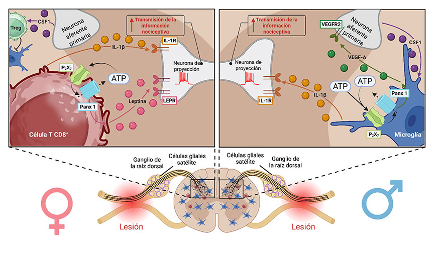 Un estudio reciente ha avanzado en el conocimiento acerca de los diferentes mecanismos de generación del dolor neuropático en hembras y machos. Los investigadores han encontrado que, aparte de los mecanismos descritos anteriormente, la activación de panexina, presente en la microglía, conduce a la liberación del factor de crecimiento endotelial vascular (VEGF) que a su vez induce dolor mediante la activación del receptor a VEGF en ratones macho, mientras que la activación de panexina (un canal que permite el paso de ATP) presente en células T (CD8+) promueve la liberación de leptina que su vez induce el dolor neuropático mediante la activación del receptor a leptina en ratones hembra con dolor neuropático (Fan et al., 2025) (Figura 3).