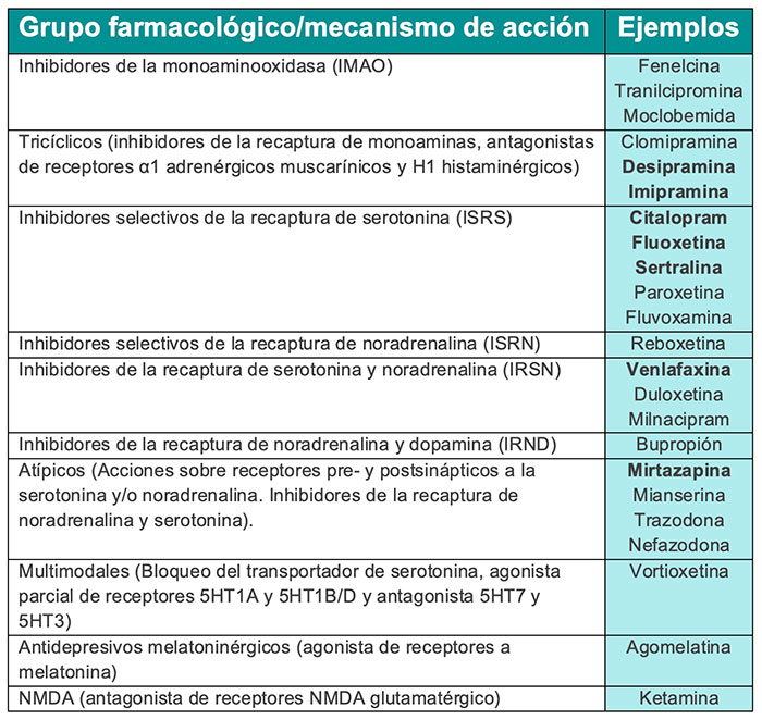 Las bases bioquímicas y moleculares de la depresión no se conocen, pero se cree que en la mayoría de los casos ocurre por una disminución en la transmisión de los neurotransmisores monoaminérgicos como la serotonina, la noradrenalina y la dopamina, ya que los tratamientos más comunes implican inhibidores de la recaptura de monoaminas, agentes multimodales (con varios sitios de acción sobre los sistemas monoaminérgicos), antidepresivos tricíclicos -también inhibidores de la recaptura de monoaminas-, inhibidores de las enzimas que degradan a las monoaminas o antidepresivos atípicos que bloquean o estimulan algunos receptores monoaminérgicos específicos (tabla 1). En la actualidad existen en el mercado dos antidepresivos que no actúan en los sistemas monoaminérgicos, la agomelatina que es un agonista melatoninérgico y la ketamina que es un antagonista de los receptores NMDA glutamatérgicos. El desarrollo de otras moléculas con acciones terapéuticas antidepresivas que no involucran a los sistemas monoaminérgicos es muy prometedor.