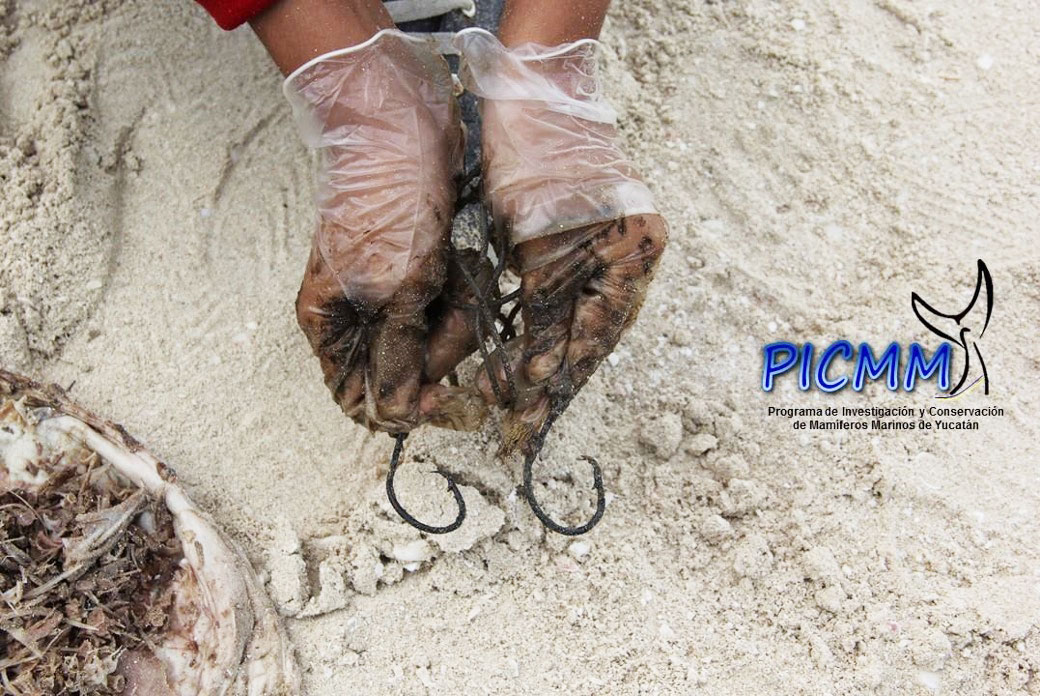 Figura 5. Anzuelos y cordel encontrados en el estómago de un delfín de dientes rugosos varado en Yucatán, México. Fuente: Programa de Investigación y Conservación de Mamíferos Marinos de Yucatán.