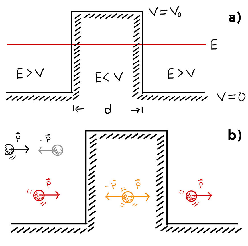 Figura 1. (a) La región d al interior de la barrera de potencial está prohibida clásicamente cuando la energía mecánica total de la partícula es inferior a la altura del potencial (E<V0). Fuera de dicha región la partícula se mueve con momento lineal P=mv. (b) Una partícula clásica que se mueve de izquierda a derecha con momento lineal P cambia la dirección de su movimiento al llegar a la región clásicamente prohibida, por lo que queda confinada a moverse solo a la izquierda de la barrera de potencial (partículas en negro y gris). El confinamiento clásico no aplica si se trata de una partícula cuántica (caricaturizada en rojo y naranja). La partícula puede ocupar la región clásicamente prohibida, incluso atravesándola por completo para continuar su movimiento hacia la derecha, más allá de la barrera de potencial.  Esto último se conoce como efecto túnel.[/caption]