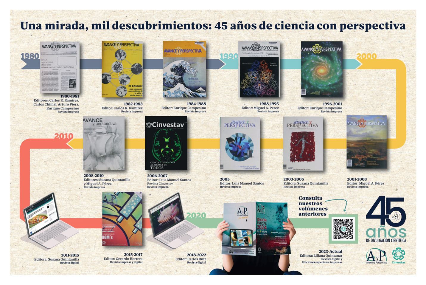 Avance y Perspectiva es la revista de divulgación científica del Cinvestav, creada con el objetivo de comunicar a la sociedad el quehacer científico de nuestra institución. El primer número de Avance y Perspectiva fue impreso en noviembre de 1980, y la revista se mantuvo como medio impreso por tres décadas. Desde 2010 a la fecha, la revista ha navegado entre épocas en las que ha sido digital e impresa, o completamente digital. En la siguiente línea del tiempo se pueden ver los detalles de los 45 años de historia de Avance y Perspectiva, y en la sección de Volúmenes Anteriores se puede consultar el acervo histórico de la revista.