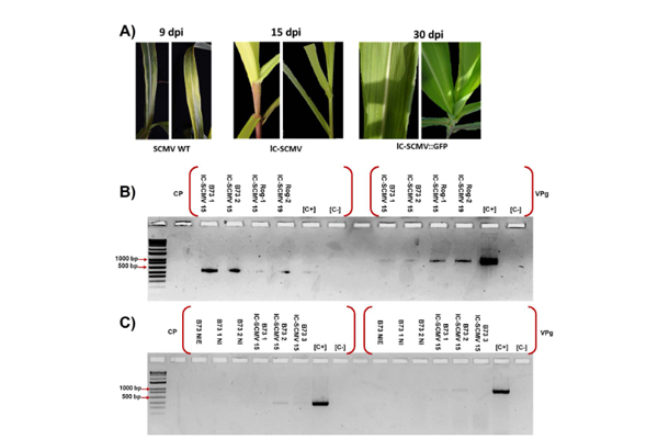 Methods: The Mexican viral isolate Sugarcane mosaic virus Veracruz 1 was used to construct an infectious clone after segment amplifications of the virus genome, intron insertion, and their further fusion by yeast homologous recombination. The clone was under the regulation of the Cauliflower mosaic virus 35S promoter and was tagged with the green fluorescent protein. Clones were then used to inoculate maize and tobacco plants and detached tobacco leaves.