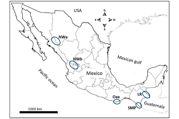 In Mexico, Plasmodium vivax transmission has been confined to the northwestern and southern regions since 2000. Parasites from five malaria foci were analyzed using three genetic markers. The circumsporozoite gene was examined by PCR-RFLP and sequencing, and pvs25 mutations and variants of ribosomal 18S SSU rRNA S-type were also determined. Previous data from the southernmost Pacific in Chiapas were included in the analysis. Both the VK210 and VK247 types of pvcsp were detected, and VK210 had greater haplotype diversity (0.860) than VK247 parasites (0.198). Two pvs25 mutations (Q87K and I130T) yielded three haplotypes, and two ribosomal variants were detected. Gene and multilocus haplotype frequencies varied among malarious foci (p < 0.001). An AMOVA test, FST values, and Spearman’s correlation suggested a structured P. vivax population among the malaria foci. Each malaria focus across the northwestern and southern regions retained a portion of the past countrywide P. vivax population, which seems unique in Latin America. In the Lacandon region (LR), a linkage equilibrium between pvs25 haplotypes and the ribosomal variants within the VK247 or VK210 populations was observed. This region harbored the broadest reservoir of P. vivax haplotypes, and the high adaptation of parasites in the northwestern region represents a challenge for malaria elimination. These finding are relevant for monitoring and epidemiological surveillance.