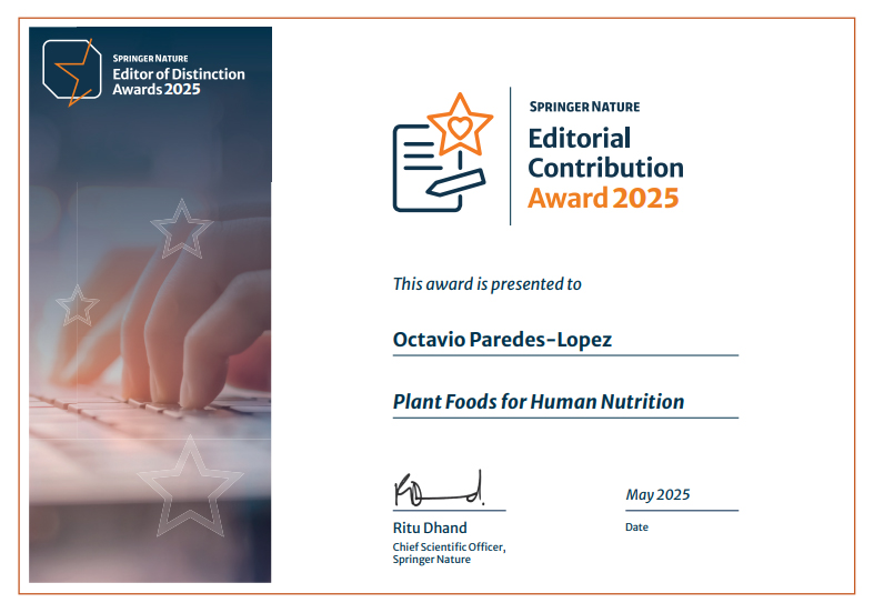 El 29 de mayo del 2025 el Dr. Octavio Paredes López recibió dos premios por parte de Springer Nature: