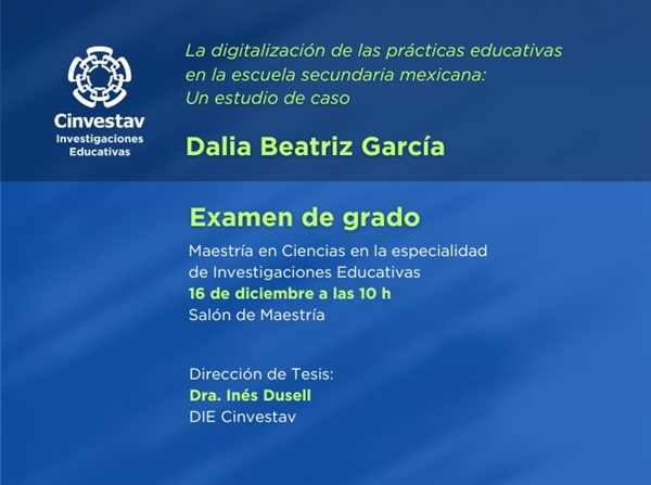 Lunes 16 de diciembre a las 10:00, en el salón de maestría, examen de grado de Maestría que presentará Dalia Beatriz García Torres, con la tesis titulada: La digitalización de las prácticas educativas en la escuela secundaria mexicana: Un estudio de caso, bajo la dirección de la Dra. Inés Dusell, Investigadora del Departamento. Su jurado está integrado por la Dra. Elsie Rockwell Richmond, y la Dra. Laura Cházaro García, Investigadoras del Departamento.