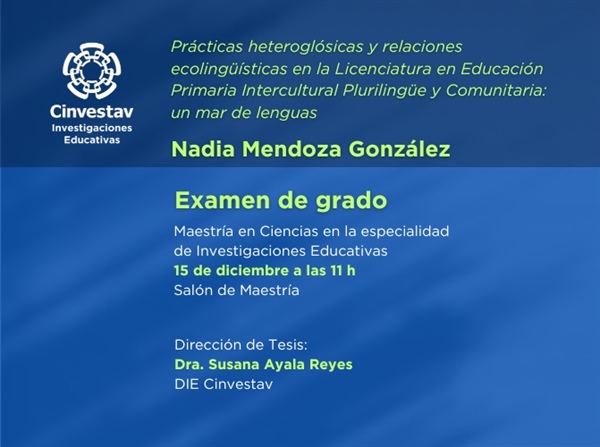 Lunes 15 de diciembre a las 11:00, en el salón de maestría, al examen de grado de Maestría que presentará Nadia Mendoza González, con la tesis titulada: Prácticas heteroglósicas y relaciones ecolingüísticas en la Licenciatura en Educación Primaria Intercultural Plurilingüe y Comunitaria: un mar de lenguas, bajo la dirección de la Dra. Susana Ayala Reyes, Investigadora del Departamento. Su jurado está integrado por la Dra. Elsie Rockwell Richmond, Investigadora del Departamento y la Dra. Julieta Briseño Roa, Investigadora en el Centro de Investigaciones y Estudios Superiores en Antropología Social (CIESAS).