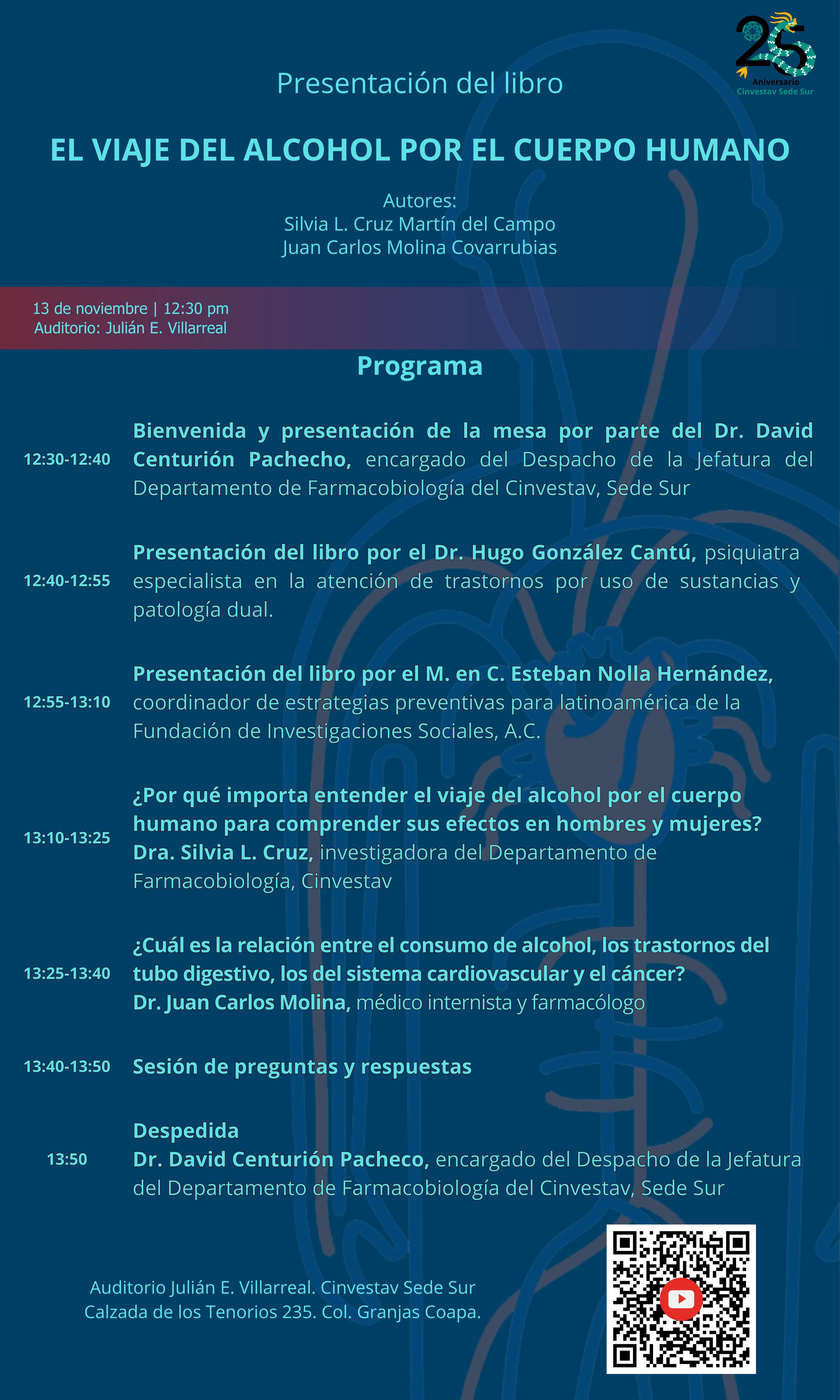 En los casos anteriores, existen bases científicas que permiten explicar las diferencias en los efectos del consumo de alcohol entre diferentes personas y cómo se calculan los nivels de alcohol en la sangre. Para ello, es necesario conocer la manera en que esta sustancia se absorbe, distribuye, metaboliza y elimina del organismo. A fin de difundir estos conocimientos se publicó el libro “El Viaje del Alcohol por el Cuerpo Humano”. Sus autores son la Dra. Silvia Lorenia Cruz Martín del Campo (Investigadora Titular del Departamento de Farmacobiología del Cinvestav) y el Dr. Juan Carlos Molina Covarrubias (Médico Internista y Farmacólogo). La publicación de esta obra fue posible gracias al patrocinio educativo de la Fundación de Investigaciones Sociales, A.C. (FISAC).
