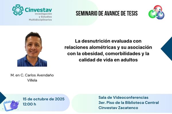La desnutrición evaluada con relaciones alométricas y su asociación con la obesidad, comorbilidades y la calidad de vida en adultos M. en C. Carlos Avendaño Villela Fecha del evento: 15/10/2025 12:00 p. m. - 02:00 p. m. Exportar evento Print