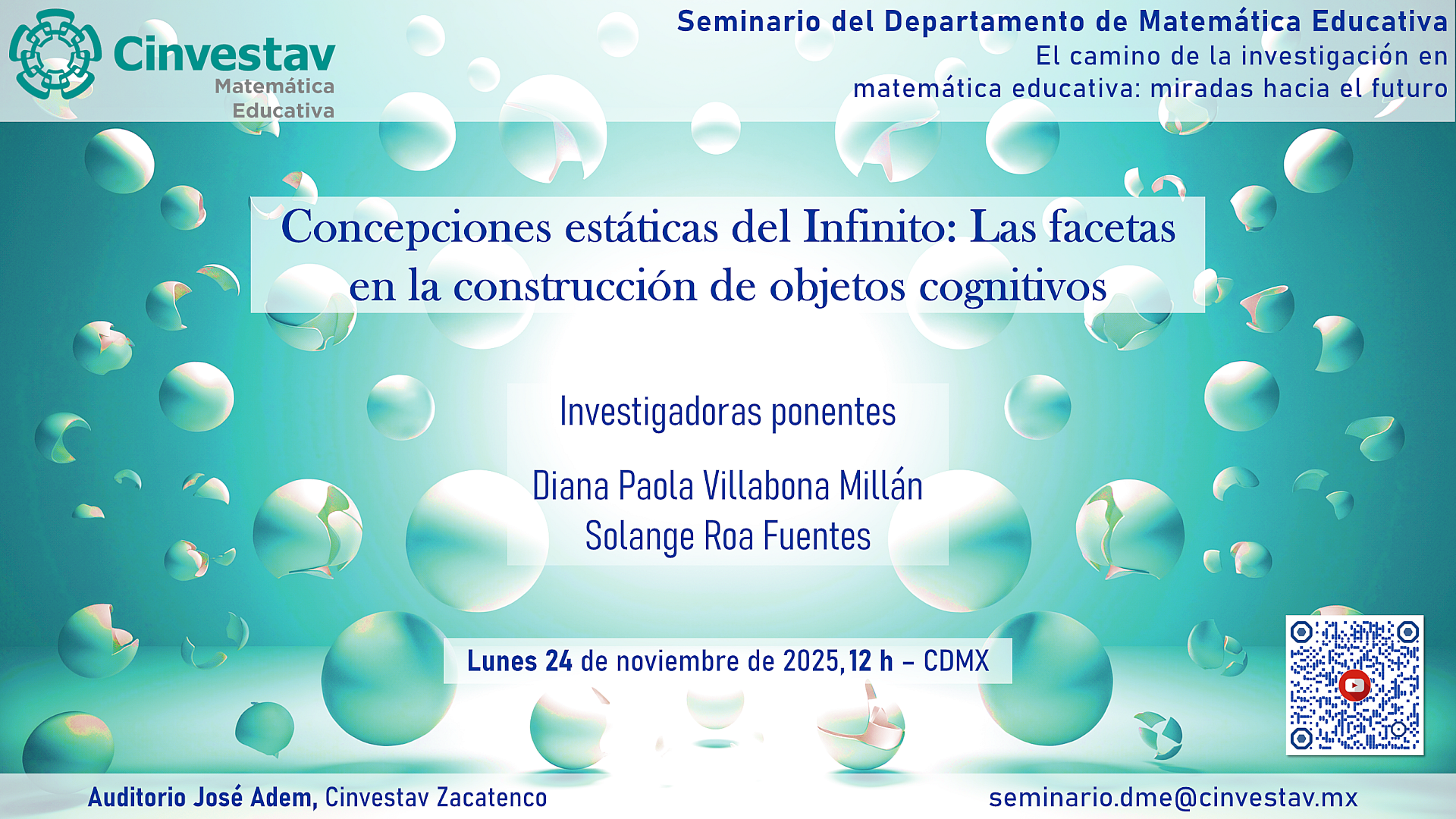 Seminaro del Departamento de Matemática Educativa El camino de la investigación en matemática educativa: miradas hacia el futuro Fecha del evento: 24/11/2025 12:00 p. m. Exportar evento Conferencia Concepciones estáticas del infinito: Las facetas en la construcción de objetos cognitivos Investigadores ponentes Diana Paola Villabona Millán Solange Roa Fuentes Lunes 24 de noviembre de 2025, 12h - CDMX Auditorio José Adem, Cinvestav Zacatenco Print