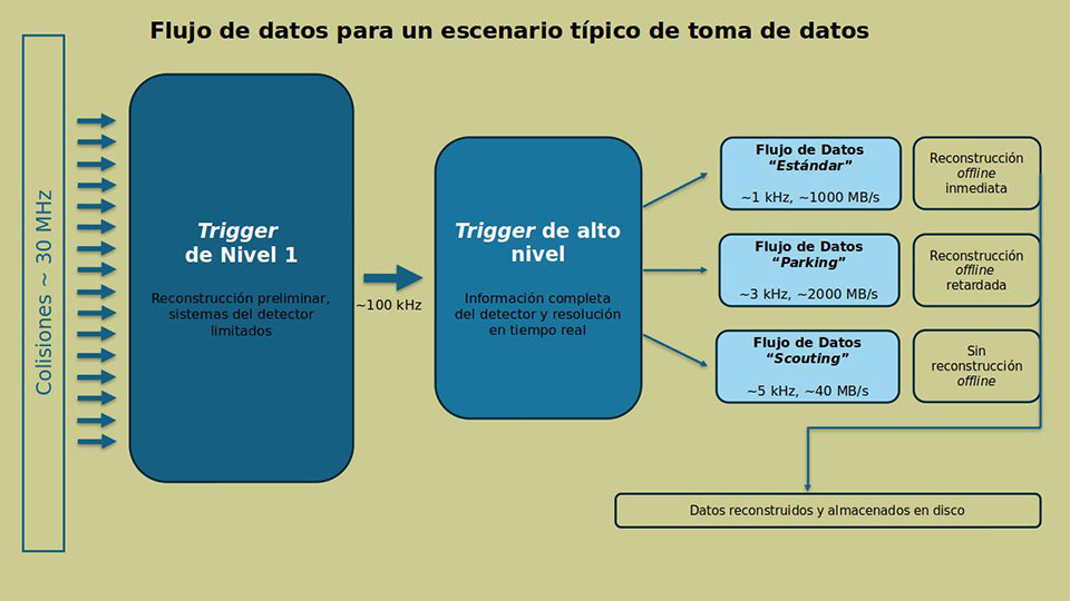 Por otro lado, el método de 'scouting' aborda el problema de manera diferente. Éste captura un gran flujo de datos a alta velocidad a costa de registrar un contenido de evento reducido, utilizando objetos físicos como jets (flujos colimados de partículas producidos por quarks o gluones de alto momento), muones y electrones reconstruidos a nivel de trigger. Solo se guardan las propiedades esenciales de las partículas, como su energía, velocidad, dirección y algunos detalles de identificación adicionales relacionados con el detector. Al mantener solo esta información reducida en lugar de todos los datos del detector, se logra una disminución considerable en la cantidad de gigabytes por segundo que estos datos normalmente ocuparían. La selección a nivel de trigger en el experimento CMS ya es excelente, lo que significa que, para muchos análisis, las diferencias entre el análisis tradicional y el basado únicamente en la información del trigger son insignificantes. En la etapa más reciente del LHC, el scouting ha permitido registrar diez mil o más colisiones adicionales por segundo, lo que abre la puerta a la exploración de tipos de colisiones completamente inexplorados en busca de diversas señales. Como ejemplo, se han estudiado exitosamente las desintegraciones de cuatro muones, culminando en la innovadora observación, por primera vez, de la rara desintegración del mesón η en cuatro muones (η→µ+µµ+µ), con una tasa de decaimiento medida del orden de 10⁻⁹[3]. Este resultado concuerda con las predicciones teóricas y mejora la precisión de mediciones anteriores del límite superior en más de cinco órdenes de magnitud.
