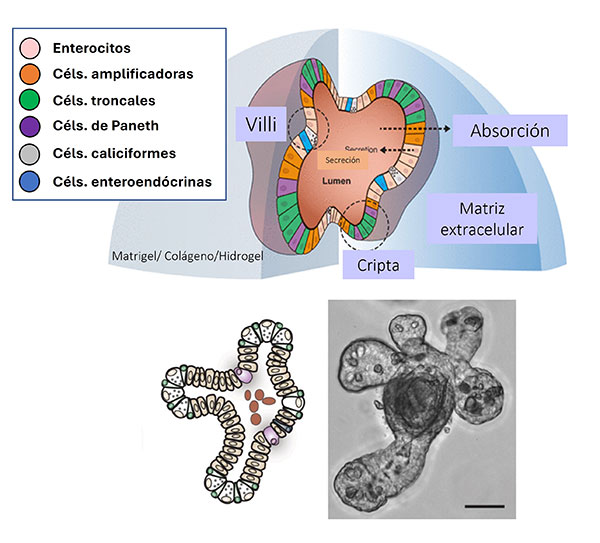 El primer modelo de organoides intestinales fue desarrollado por Sato y colaboradores. (2009), quienes generaron organoides epiteliales (enteroides) con criptas y epitelio formando las características vellosidades intestinales. Para desarrollar este modelo se aislaron por primera vez las células madre intestinales que expresan el receptor acoplado a proteína G (Lgr5+), mismas que fueron sembradas en matrigel e inducidas a diferenciarse, permitiendo que se formaran los característicos nichos intestinales en tercera dimensión. A partir de ahí, se desencadenó el auge de los organoides con múltiples aplicaciones en la biomedicina, incluyendo estudios filogenéticos, pruebas de fármacos, ensayos de citotoxicidad, modelado de enfermedades crónico-degenerativas, edición genética, medicina regenerativa y de precisión, así como el estudio de las enfermedades infecciosas (Fig. 2).