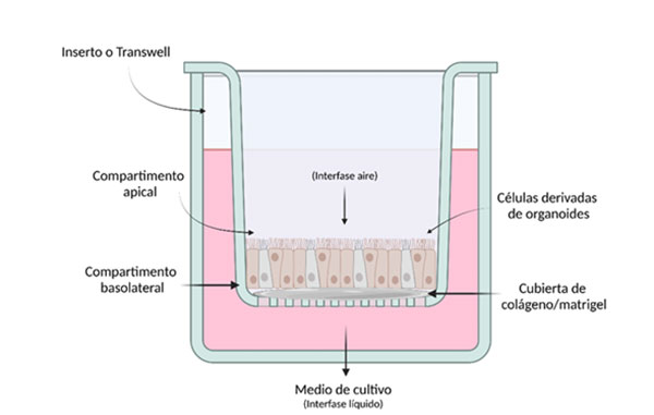 Fig. 3 Monocapas derivadas de organoides en interfase aire-líquido (ALI). El sistema ALI permite que las células se polaricen, exponiendo la región apical y facilitando la interacción con patógenos, células del sistema inmune, componentes de la microbiota, etc. La absorción de nutrientes ocurre por la región basolateral. Creado en https://BioRender.com