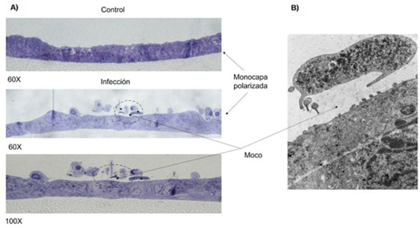 Fig. 4 Monocapas derivadas de organoides murinos infectadas con trofozoítos de G. intestinalis en el sistema ALI. A) Cortes semifinos teñidos con azul de Toluidina muestra la monocapa sin infectar ( control) y monocapas infectadas con el parásito. B) Micrografía de un trofozoíto de G. intestinalis infectando la monocapa derivada de organoides observadas por microscopía electrónica de transmisión.