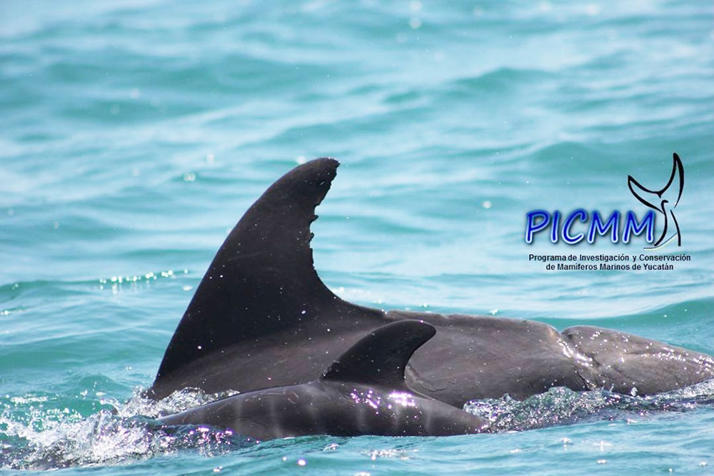 Figura 4. Madre y cría recién nacida en la costa de Las Coloradas, Yucatán.  Pueden observarse líneas que se les conoce como marcas de los pliegues fetales en la cría. Fuente: Programa de Investigación y Conservación de Mamíferos Marinos de Yucatán.
