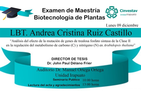 Les invitamos al examen final de la LBT Andrea Cristina Ruiz Castillo para obtener el grado de Maestría en Biotecnología de Plantas