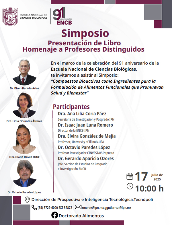 En el marco de la celebración del 91 aniversario de la Escuela Nacional de Ciencias Biológicas el pasado 17 de junio de 2025 se llevo a cabo el Simposio “Compuestos Bioactivos como Ingredientes para la Formulación de Alimentos Funcionales que Promuevan Salud y Bienestar” mismo que contó con la participación del Dr. Octavio Paredes López, profesor Emérito de Cinvestav Irapuato.
