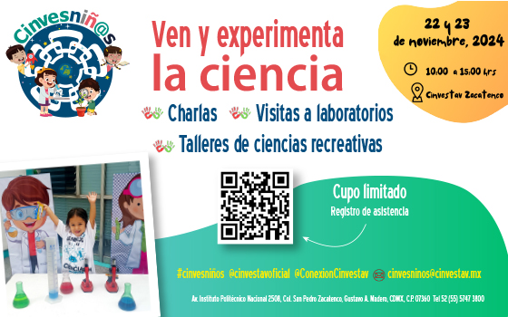 Cinvesniños Fecha del evento: 22/11/2024 - 23/11/2024 Exportar evento Ven y experimenta la ciencia 23 y 23 de noviembre del 2024 de 10 a 15 horas Cinvestav Zacatenco Charlas, visitas a laboratorios, talleres de ciencias. Registro de asistencia Ubicación: Print