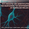 Abstrac: Müller glia (MG) are retinal resident cells with diverse functions, including reprograming and regeneration in certain species. While the mammalian retina possesses molecular mechanisms for MG dedifferentiation and neuronal differentiation, it fails to generate neural progenitors in vivo. We previously proposed that an epigenetic barrier, driven by DNA methylation, may prevent complete MG reprograming in response to damage. DNA demethylases, such as Ten-Eleven Translocation (TET) and Growth Arrest and DNA Damage-Inducible Protein 45 (GADD45) families, are induced by damage and play roles in cellular reprograming and regeneration. Tet enzymes are regulated by metabolic factors (iron, vitamins A and C) and respond to environmental stimuli. Here, we investigated DNA demethylation as a regulatory signal for MG dedifferentiation and neuronal differentiation in response to N-methyl-D-aspartate (NMDA), a neurotransmitter used to model retinal neurodegeneration. Using mouse primary cultures and antibodies against methylated (5mC, MeCP2) and unmethylated (5 hmC, H3K4Me3) DNA, we analyzed MG epigenetic changes under control, vitamin-supplemented, and NMDA-stimulated conditions. We also assessed DNA demethylase expression and key reprograming genes (Ascl1, Lin28, Nestin). Vitamin A and C increased 5hmC levels but did not upregulate Tet enzymes or reprograming genes. In contrast, NMDA increased Tet3 and reprograming gene expression. Tet3 knockdown led to a rapid 5mC increase and impaired NMDA-induced upregulation of Ascl1, Lin28, and Nestin, suggesting its critical role in MG dedifferentiation. Conversely, Tet3 overexpression induced morphological changes and early neuronal marker expression. These findings identify Tet3 as a key epigenetic regulator of MG reprograming and a potential target for retinal regeneration strategies.