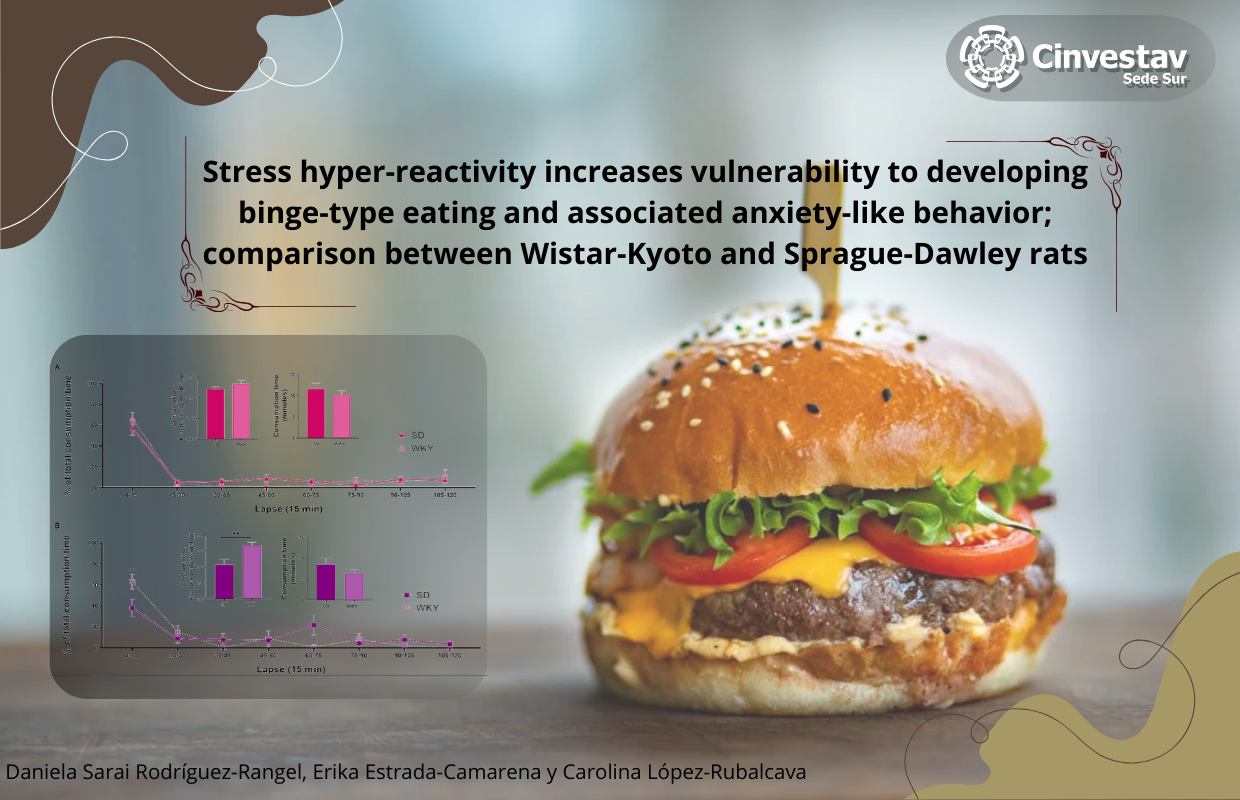 Invitamos a leer el artículo: " Stress hyper-reactivity increases vulnerability to developing binge-type eating and associated anxiety-like behavior; comparison between Wistar-Kyoto and Sprague-Dawley rats", realizado por la Dra. Carolina López-Rubalcava, Investigadora de Cinvestav Sede Sur