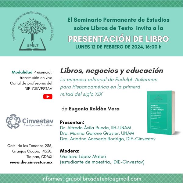 Fecha del evento: 12/02/2024 Exportar evento Luis Enrique Hernandez Martinez / martes, 30 de enero de 2024 / Categorías: Banner Secundario Home Sur DIE, Investigaciones Educativas Presentación de libro: Libros, negocios y educación. SPELT, DIE, Cinvestav. Print 158 Califica este artículo: Sin calificación Please login or register to post comments.
